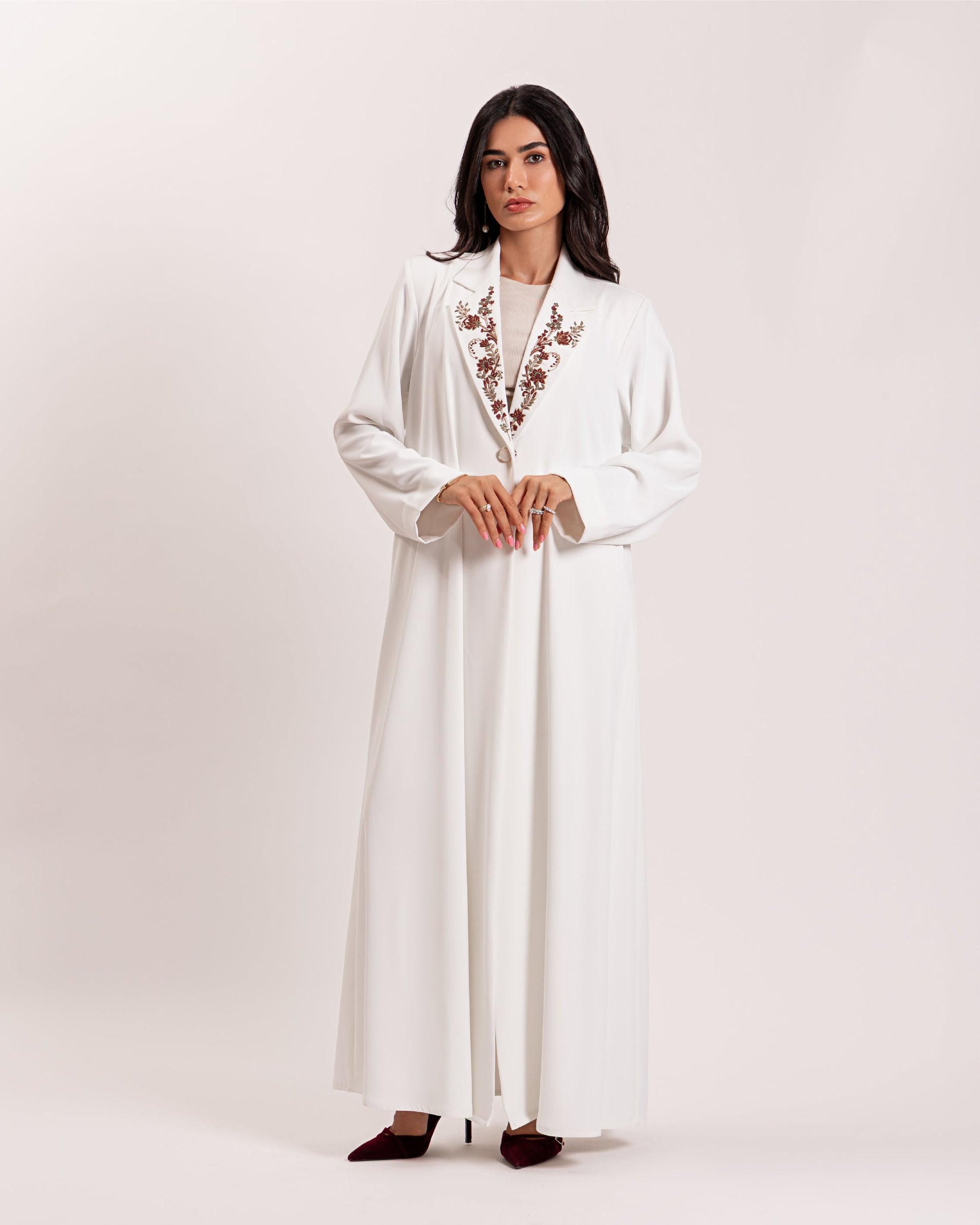 The Ahlam Abaya is crafted from lightweight crepe fabric in an elegant off-white shade. It features delicate handmade embroidery on the collar, adding a refined touch to its graceful design.