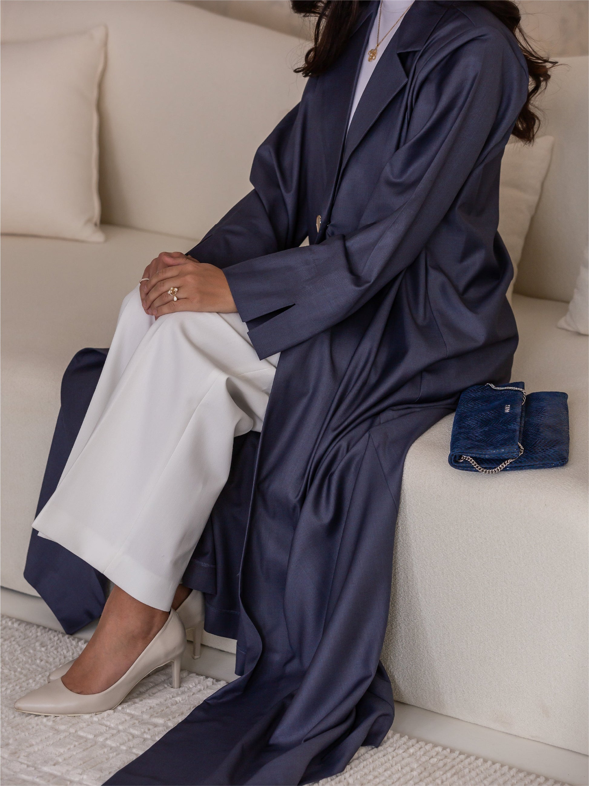 Aisha Abaya, designed for the modern woman who values effortless elegance. Featuring a sleek lapel collar and a single statement button, the crepe luxury cotton fabric ensures comfort and elegance, making it perfect for work, meetings, and stylish everyday wear.
