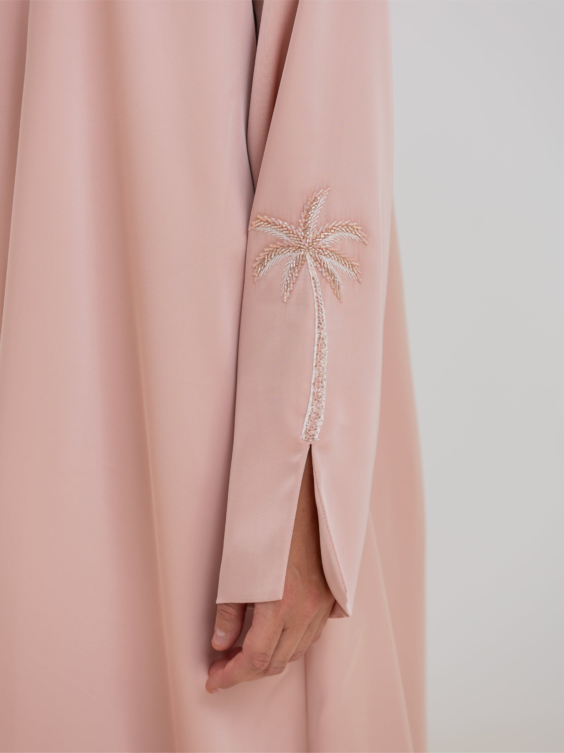 AlAnoud Abaya, inspired by the beauty of Arabian heritage, this elegant abaya is a true statement of grace. The soft blush tone is complemented by delicate palm tree embroidery, symbolizing timeless elegance and cultural richness. Crafted from luxurious, flowy satin fabric, the refined piping details add a modern touch. It comes with an inner lining, making it the perfect choice for Ramadan.