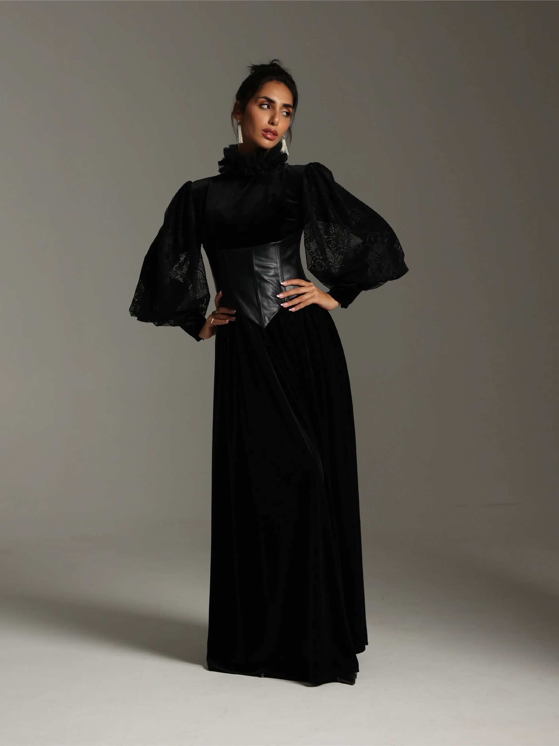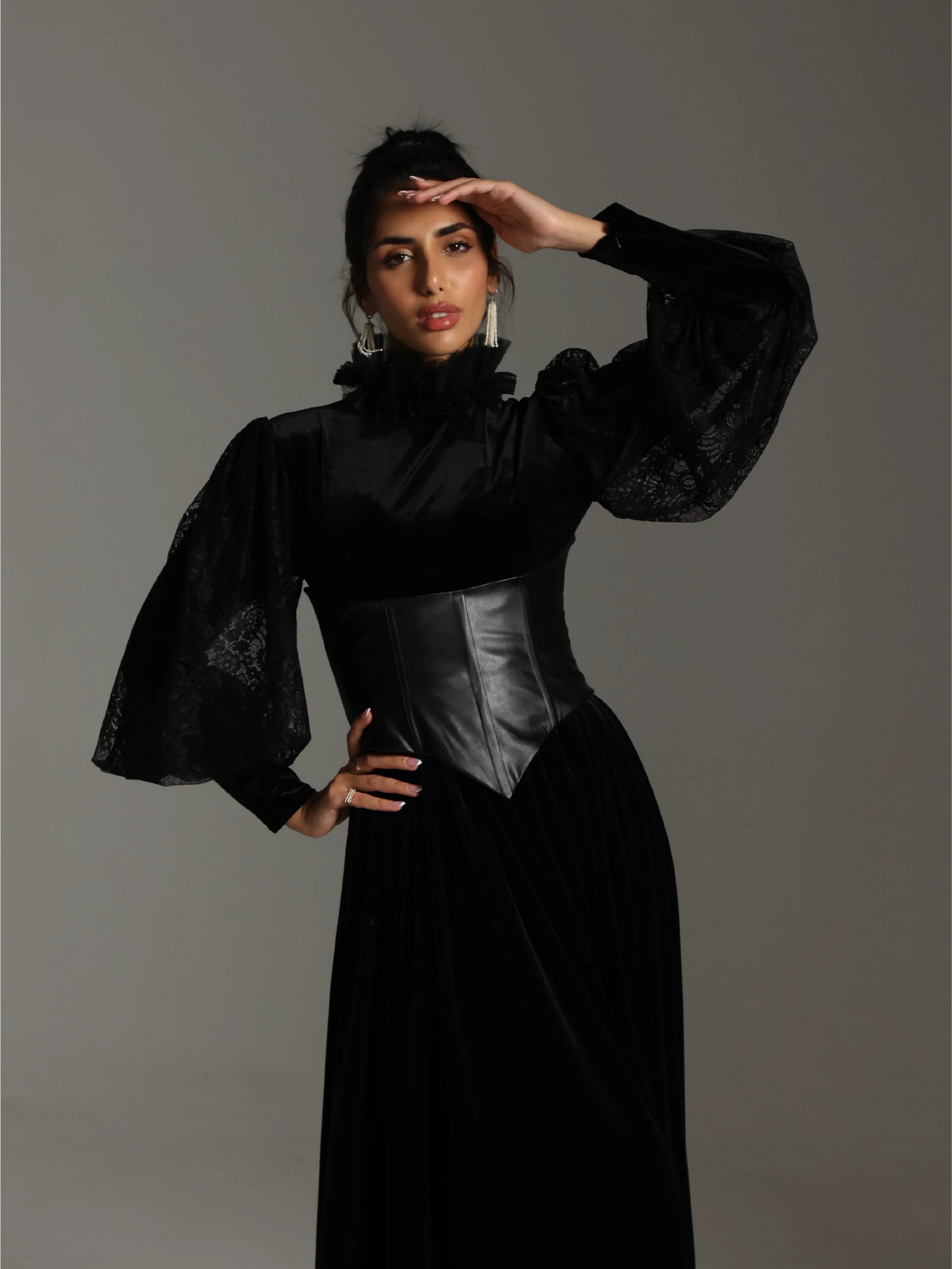 Dorora dress features a mix of lace, velvet, and leather with puffed lace sleeves, a velvet bodice, and a structured leather corset. The flowing skirt and high neckline add a bold yet elegant vintage touch.