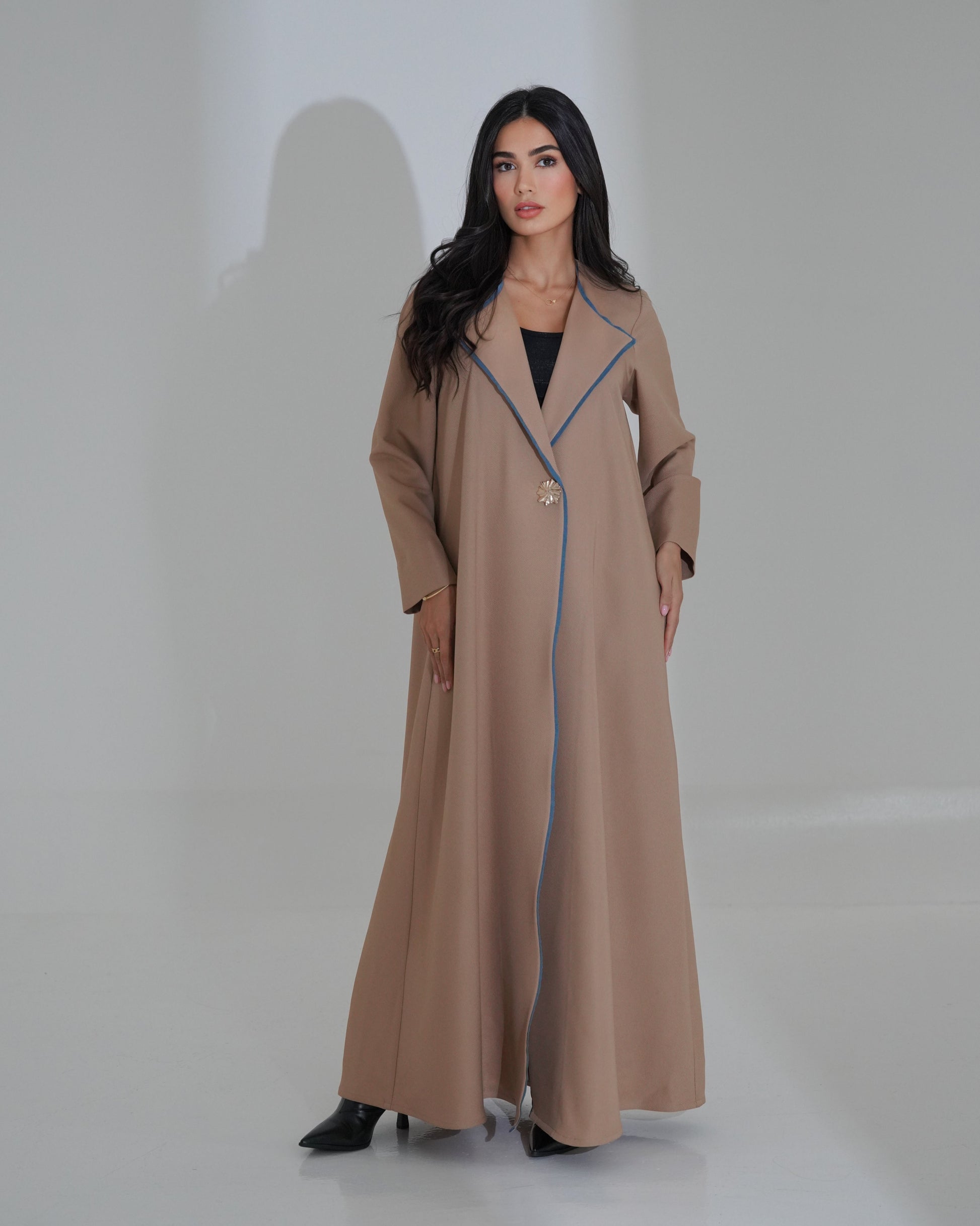 Made from crepe fabric in camel with blue piping, designed in an A-line cut with a bold oversized collar.
