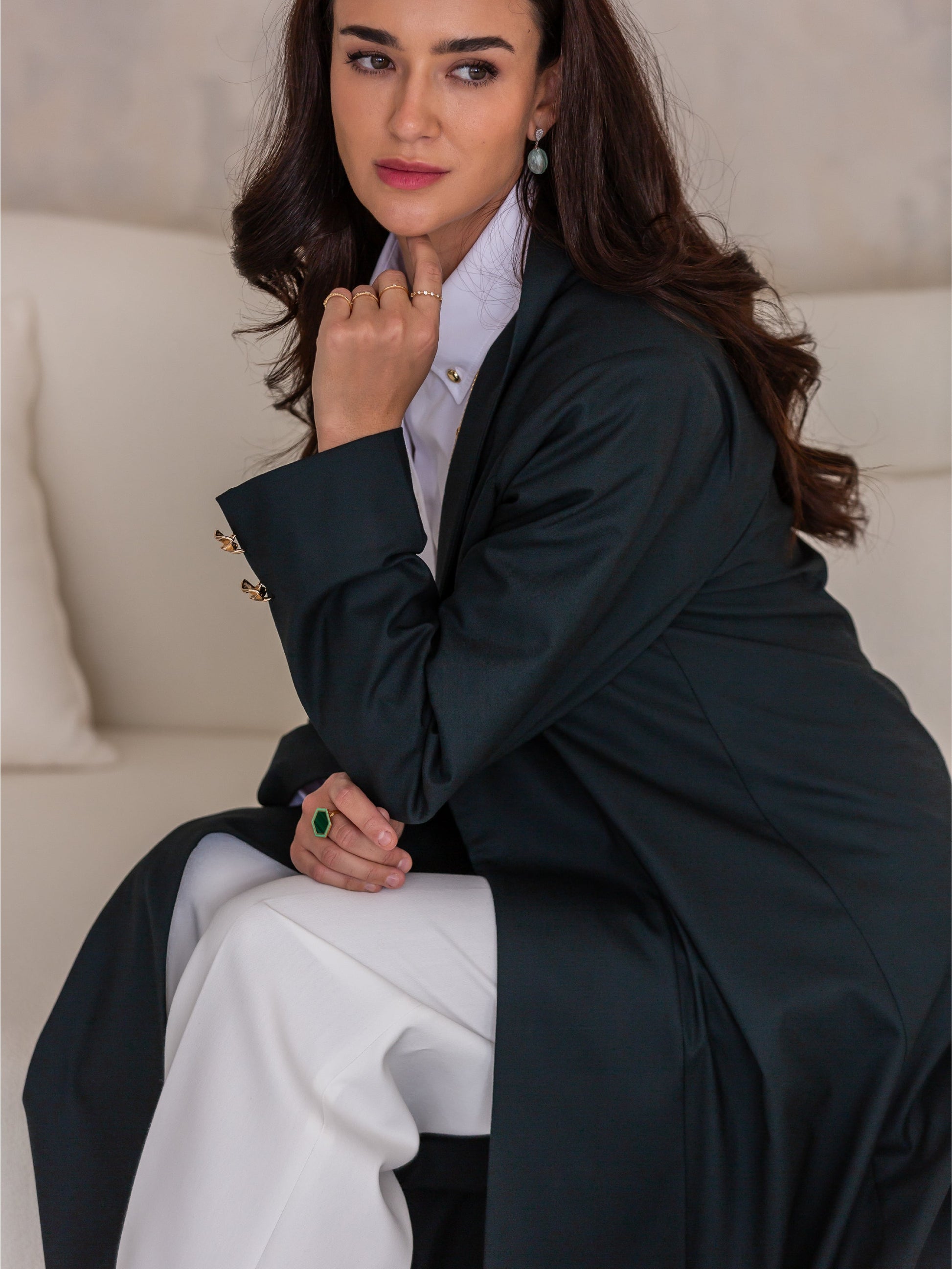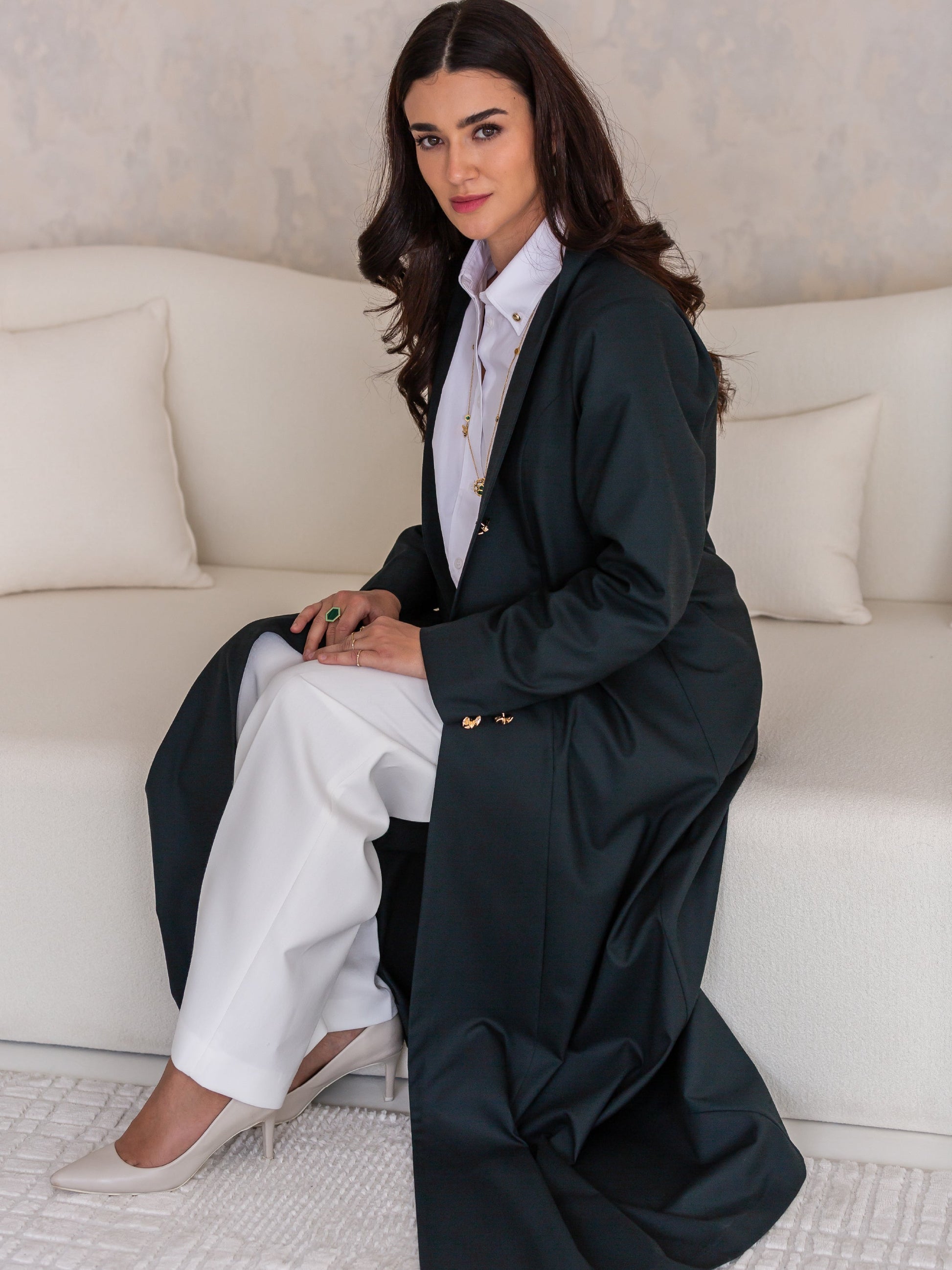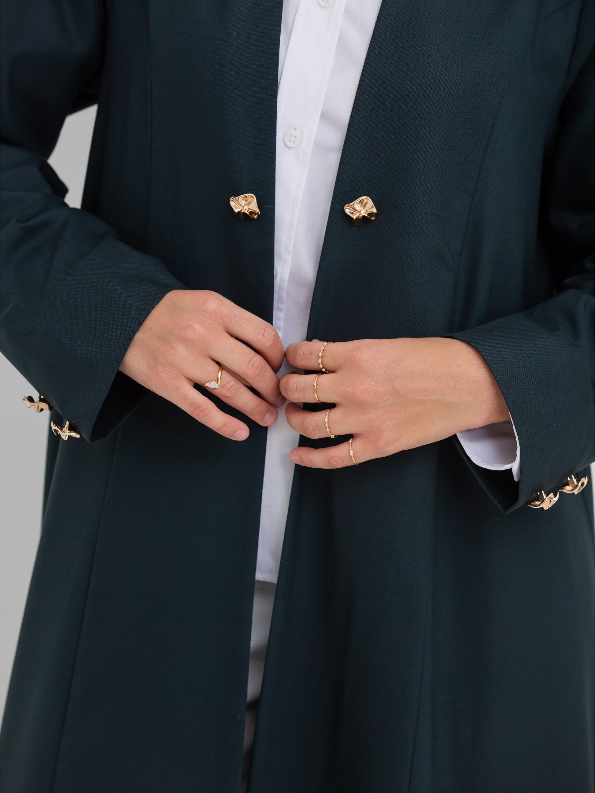 Selma Abaya is a timeless blend of elegance and simplicity. This deep emerald green abaya is designed for the modern woman who values both style and refinement. It comes with gold buttons on the sleeves and the front, adding a touch of glamour—perfect for work and formal gatherings.