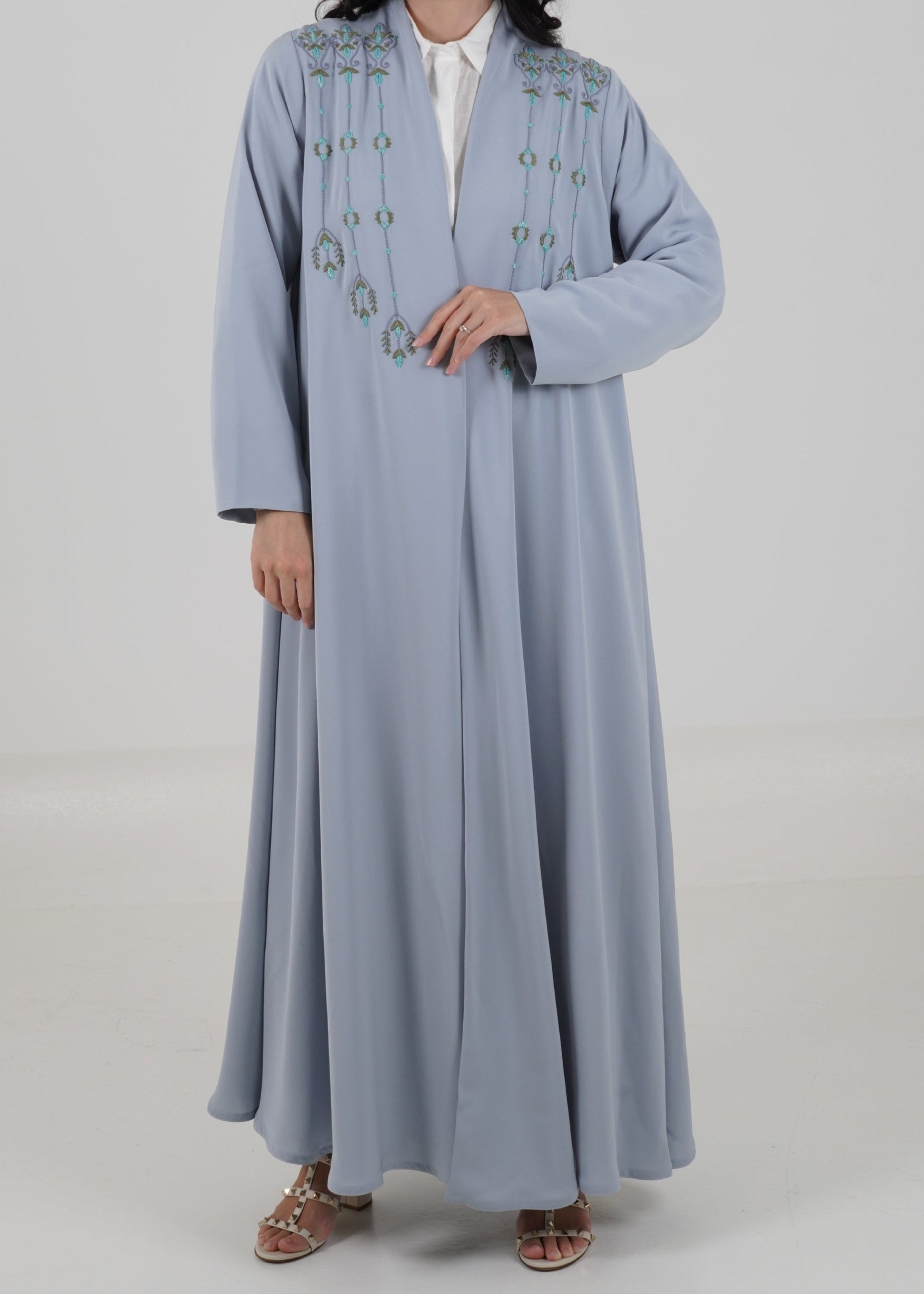 The Siba Abaya comes in a soft baby blue color, designed with an elegant A-line cut for a flattering silhouette. It is beautifully crafted with delicate embroidery on the front, adding a refined and graceful touch to the overall look.